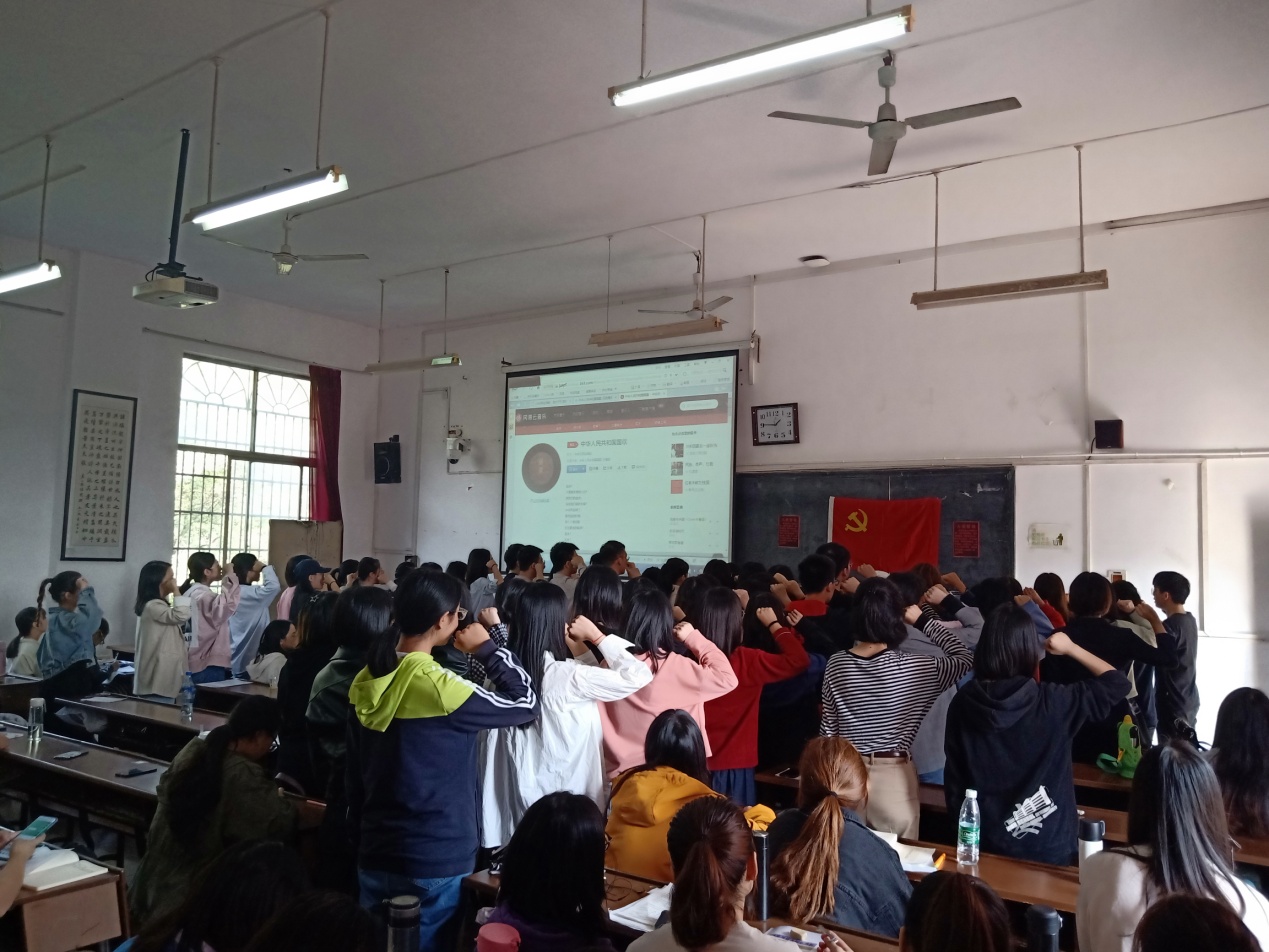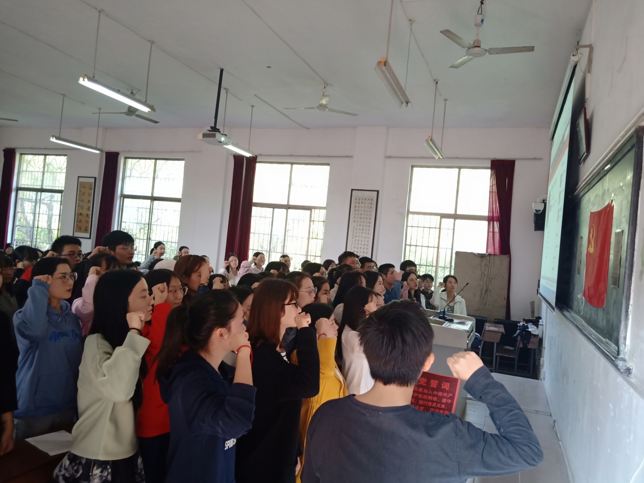 入党宣誓仪式在雄壮的国歌——《义勇军进行曲》中拉开帷幕。主持人宣读参加宣誓的预备党员名单,预备党员卜柯文领读入党誓言:“我志愿加入中国共产党,拥护党的纲领,遵守党的章程……永不叛党!”全体预备党员面向党旗庄严宣誓。