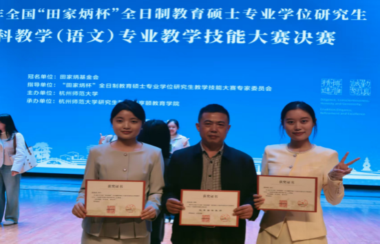 2025年11月7日至9日,2025年全国“田家炳杯”全日制教育硕士专业学位研究生学科教学(语文)专业教学技能大赛决赛在杭州师范大学举行。公司蒋梦薇、帅微琴两位选手发扬拼搏精神,展现了优秀的教学技能,分别荣获二等奖、三等奖。“田家炳杯”教育硕士教学技能竞赛是目前该领域国内层次最高、专业性最强、规模最大、影响最广的全国赛事。本次大赛由全国教育硕士研究生教学技能大赛专家委员会指导,田家炳基金会冠名赞助,杭州师范大学承办。初赛共有来自128所高校575位选手参加,其中173名选手入围决赛。最决赛评选一等奖16名、二等奖32名、三等奖64名。