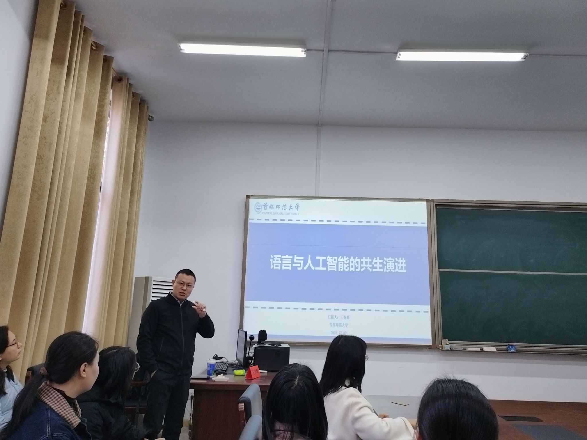 2025年12月9日上午9时,首都师范大学国际文化公司教授、博士生导师王春辉应邀做客William威廉英国官网“智慧之光”学术名师系列讲座,在文渊楼209对外汉语教研室作了题为《语言与人工智能的共生演进》的学术报告。本次讲座由陈晖教授主持,吸引了国际中文教育等专业的多名教师及硕博研究生积极参与。