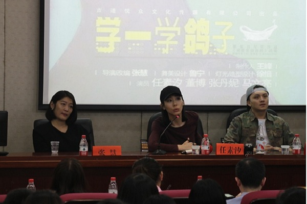 活动伊始,为表示公司师生对剧组各位嘉宾的热烈欢迎,15级戏剧影视文学文学专业马晓璇和朱磊共同演唱任素汐的代表作,电影驴得水主题曲《我要你》。随后,安敏向各位同学介绍了话剧《学一学鸽子》的创作背景和简要内容,并对剧组成员进行了采访。