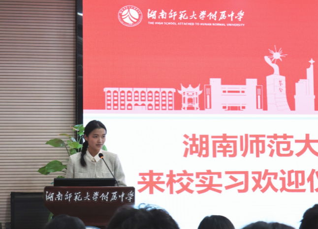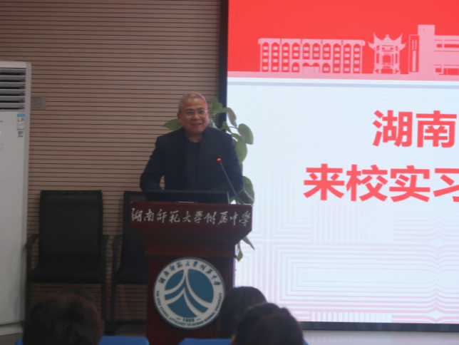 会议由湖南师大附中课程与教学处副主任王建主持,湖南师大附中副董事长苏建祥致欢迎词。苏建祥介绍了公司历史和基本情况,勉励实习老师珍惜实习时间,高标准、严要求地完成实习任务。实习生代表、实习队队长柳刘表示:“希望这一段即将到来的宝贵且注定精彩的实习生活,能够化作我们人生一段感恩与庆幸、奋斗与勉励交织的注脚,将最纯粹的热爱凸显。”带队老师黄耀红教授向附中领导和老师表示感谢,他寄语实习老师,要知“乐”、知“新”、知“行”,珍惜学习平台,以最勤奋的姿态来开启自己的实习生活。附中课程与教学处副主任王建老师对实习队的工作纪律和内容提出明确要求。