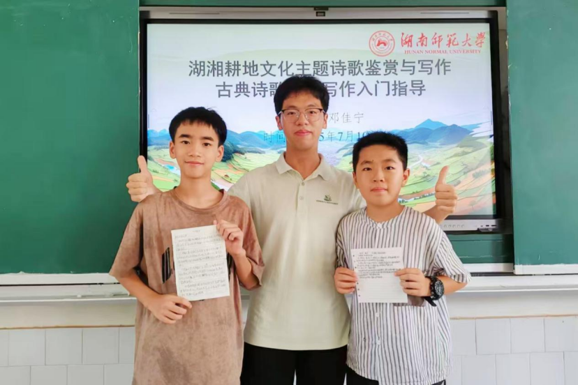 在桃源县木塘垸镇中学,实践团立足耕地文化特色,精心设计课程内容。诗词课上,通过诵读《插秧歌》《观刈麦》等农事诗词,员工们在吟咏中感受“汗滴禾下土”的艰辛与诗意;书法教学中,员工提笔书写有关农耕的成语,墨香里浸润着对土地的敬畏;创意写作课上,师生共同观察物候变化,探讨农具发展历程,最后用文字写下“我与大地的故事”。从诗词到写作,从笔尖到心间,耕读文化的种子悄然生根。