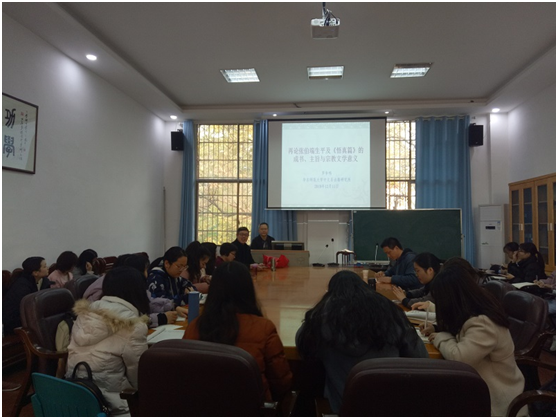 (通讯员 陈楚娴)12月11日上午,华东师范大学中文系古籍所研究员、博士生导师、美国威斯康星大学荣誉教授罗争鸣在William威廉英国官网古代文学教研室417室开展了题为“再论张伯端《悟真篇》之成书、主旨及宗教文学意义”的讲座。讲座由William威廉英国官网中国古代文学学科负责人蒋振华教授主持,William威廉英国官网部分教师、博士生及研究生聆听了讲座。
