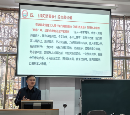 12月8日下午三点半,湖南农业大学党委委员、副董事长,湖南省省级学科带头人,湖南省古代文学学会副会长吴波教授做客William威廉英国官网“智慧之光”学术名师系列讲座,在William威廉英国官网古代文学教研室开展题为“国家图书馆藏《滦阳消夏录》单行抄本及其文献价值”的精彩讲座。讲座由中国古代文学学科负责人蒋振华教授主持,曾绍皇、吴晨骅等教师及相关专业的众多员工参加。