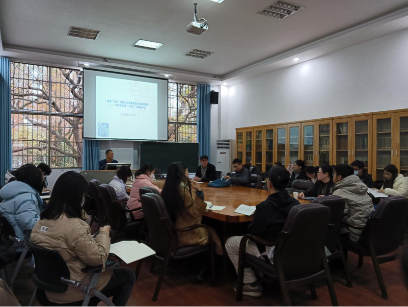 蒋振华首先致欢迎辞,介绍了沈文凡教授在教育方面的经历和成就,对道教中的上梁文作了简要介绍。接下来,沈教授以吴少微《哭富嘉谟》、李渊《即位大赦诏》、孔志约《本草序》等唐代诗文为引,剖析了杜甫“大庇”思想的发端,论述了“大庇”一词之所以在韩国上梁文中出现频率较高,主要原因是韩国文人对杜甫诗歌“民胞物与”的接受程度要高于唐代其他诗歌,此外还与韩国对杜甫显赫家族史的关注等因素有关。同时,沈教授对韩国李廷龟《明伦堂上梁文》“从此大庇寒士,不翅广厦千万间”、尹凤五《德山县祝旻堂重修上梁文》“愿言官惠同乔阴,大庇十方无欠旷”、李晚秀《华城东将台上梁文》“自南自北自东西,总入吾王大庇厦”、洪奭周《会祥殿上梁文》“大庇群生须广厦”等多篇上梁文文本进行了细致解读,联系韩国部分建筑的实际情况,分析了“大庇”思想在韩国建筑民俗文化中的重要影响,由点到面,小题大做,见解深刻,耐人寻味。沈教授还主张做学问应当深入浅出,鼓励同学们肩负文化使命,积极传播古代优秀传统文化。在互动环节,有同学就“乡音无改鬓毛衰之‘衰’字在当代的发音”“上梁文公私行文中的文体区别”等进行提问,沈教授运用扎实深厚的文史学知识,对这些问题进行了深入的解答。