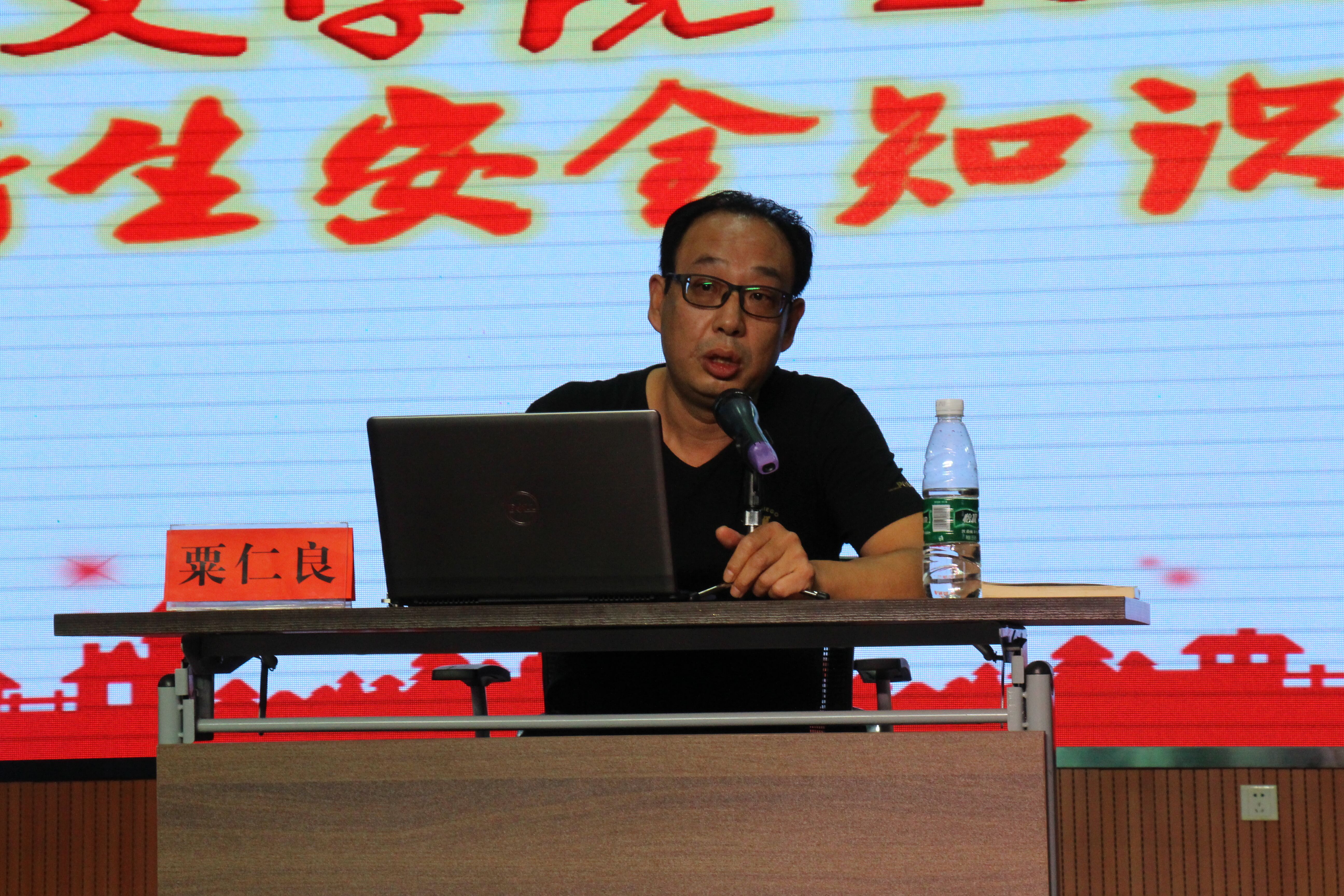 讲座的开展旨在创建平安校园,维护大学新生的人身、财产安全,提高老员工的安全防范意识与自我保护能力。粟仁良首先为同学们介绍了各高校及本校曾发生的安全事件,指出校园安全教育工作的紧迫性和必要性,进而围绕国家安全、财产安全、交通安全、防邪教四个方面展开论述。