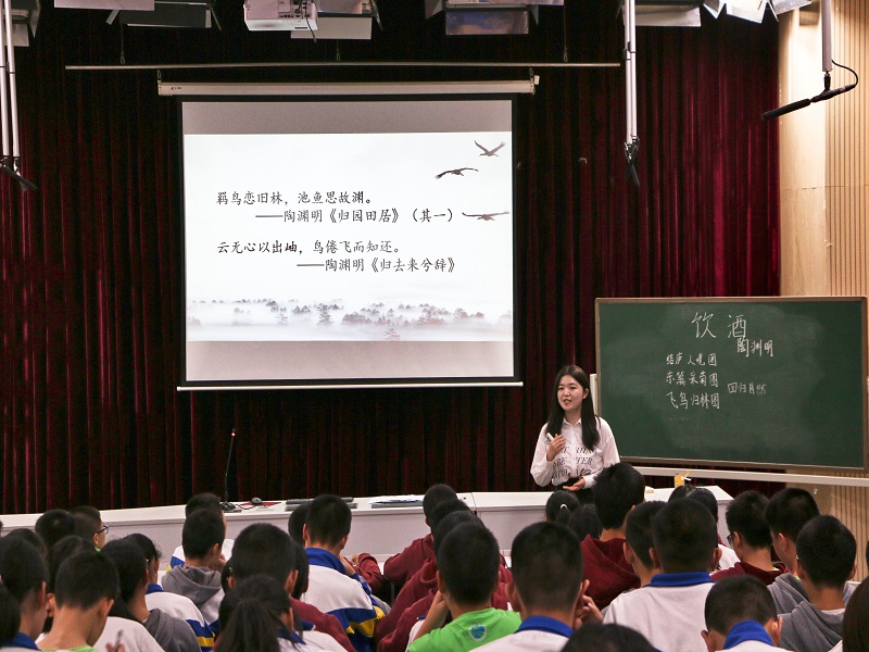 伍芳主讲《植树的牧羊人》,共设置了四个环节,涵盖了听说读写等不同教学活动。其亮点体现在板书设计以及引导性问答上,层层递进,生动有趣。喻书怡主讲《饮酒(其五)》,对文本解读深入全面,诗词积累充分,内容充实、方法平实、意蕴厚实,师生互动多,课堂气氛活跃。