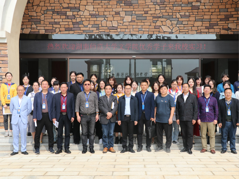 会议结束后,全体与会人员于行政楼下合影留念。任海波带领实习队员们与任课老师洽谈对接,进行具体实习工作的指导。至此,公司17级赴湘阴文郡洋沙湖中学实习队见面会结束。