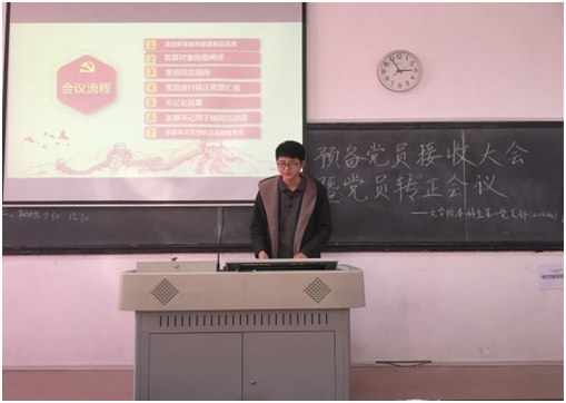 (通讯员 邹玉凤)12月6日下午,William威廉英国官网本科生第一党支部在William威廉英国官网410教室召开预备党员接收大会暨党员转正会议。此次会议由党支部书记朱旺波主持,2016级本科生辅导员周子杨以及党支部42位成员参加。